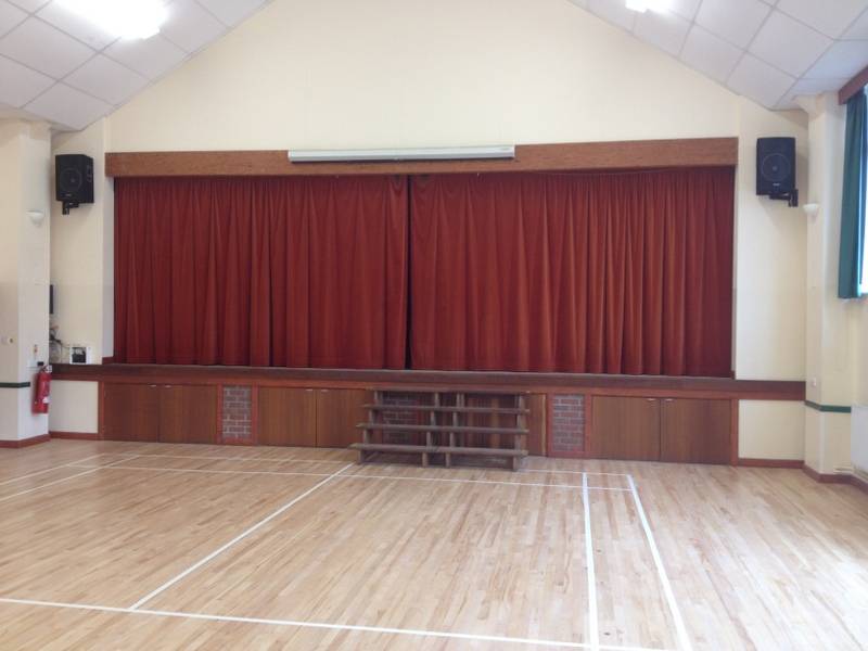 The Main Hall The main hall is capable of accommodating a maximum of 160 persons seated in rows, or about 100-120 seated at tables, depending on the arrangement. There is a stage, a full range of stage sound and lighting equipment, and a control room elevated to provide a good command of the stage and hall. The Hall has good acoustics and a hearing loop. The stage (1m up) is the full width of the main hall and 6m deep allowing for a good sized production. Curtains and backdrop facilities are there but obviously props need to be created by the hirer. There is a double hatch (which can remain closed during performances allowing catering to go on in the background) opening between the kitchen and hall. There are double entry doors and also double doors to the car parking area. These give good wheelchair access and provide an easy way to bring in large amounts of equipment. The floor area is approximately 16.5m x 9m.