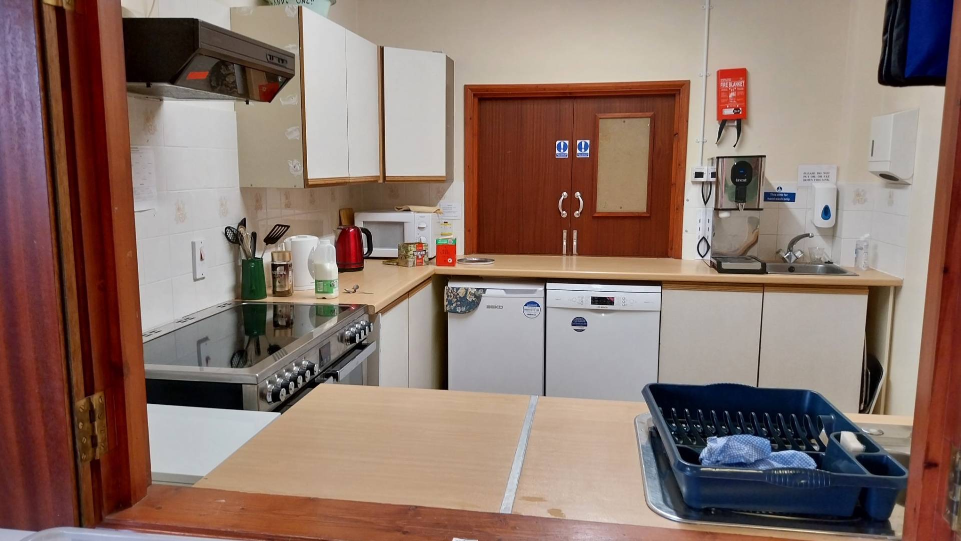 Oven, microwave, fridge and usual equipment including a plumbed in water boiler with a capacity of 9 litres and a reheat time which should allow continuous serving of tea and coffee. 4 persons can comfortably work in this area. This is equally accessible from the main hall and the meetings room so anyone requiring exclusive access must book the full hall.
